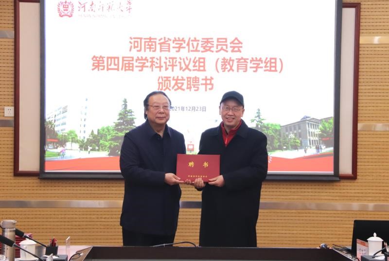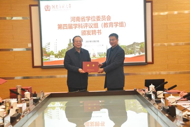会上,河南师范大学党委书记、教育学科评议组召集人赵国祥教授为电子游戏官网院长何安明教授、张茂林教授等专家组成员颁发聘书。