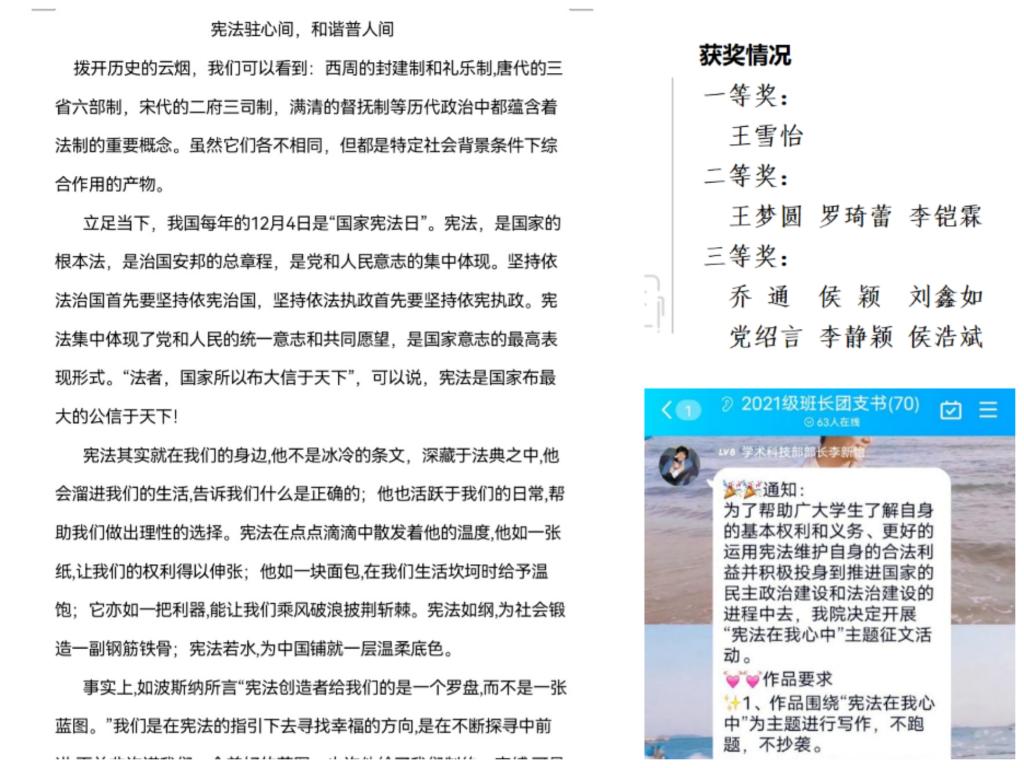 评委们从文章主题、结构、内容、语言四个角度进行评判,最终,王雪怡的《宪法驻心间,和谐普人间》荣获此次比赛一等奖,王梦圆、罗琦蕾、李铠霖荣获二等奖,乔通、侯颖、刘鑫如、党绍言、李静颖、侯浩斌荣获三等奖。