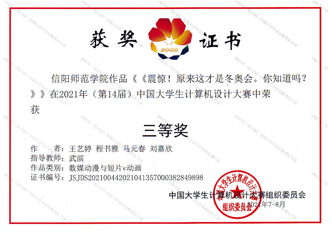 时间:2021-10-05 18:20:28 来源: 作者: 阅读: 次近日,由国家教育部主办的2021年第十四届中国大学生计算机设计大赛落下帷幕,在厦门决赛赛区数媒动漫与短片普通组比赛中,电子游戏官网两组作品经过河南省大赛推选,与全国上百所高校参赛作品进行角逐,最终脱颖而出,均荣获国家级三等奖。获奖作品是由电子游戏官网教育技术系老师武滨指导,王艺婷、马元春、刘嘉欣和程书雅完成的动画作品《震惊!原来这才是冬奥会。你知道吗?》,刘萱、刘琦老师指导,郭嘉、张欣欣、代昭、余金阳和马倩完成的动画作品《速滑小讲堂》。