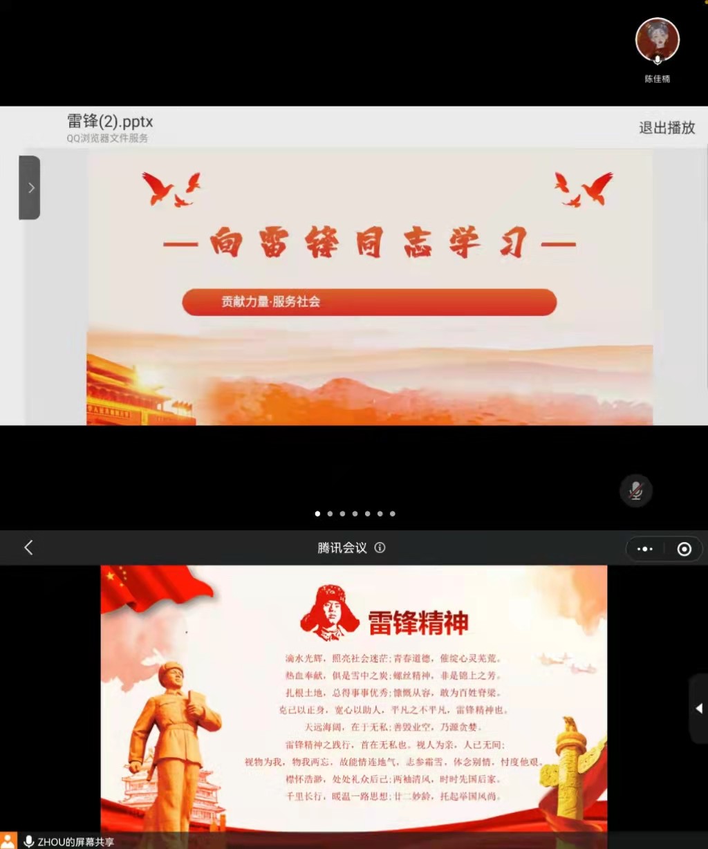 时间:2022-03-27 13:44:53 来源:教科院新闻部 作者:马玉娇 周媛媛 亓亚兴 阅读: 次适逢三月雷锋月,为弘扬雷锋精神,践行雷锋精神魅力,3月26日,澳门正规电子游戏平台大学生摄影爱好者协会、童真话剧社、心悦社分别通过腾讯会议于线上开展“学习雷锋精神,争做时代先锋”雷锋月主题团课活动,全体同学积极参加。