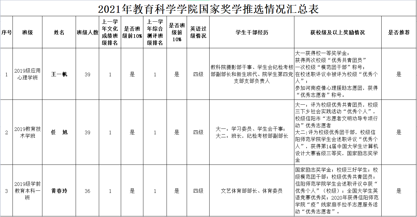 附:2021年澳门正规电子游戏平台国家奖学金推选情况汇总表