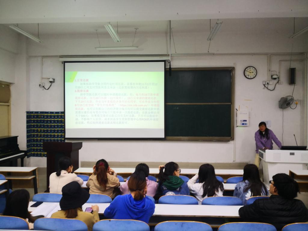 在本次宣讲会上,朱方首先从政策介绍、还款规则、还款方法、毕业确认、应届毕业生考入研究生办理助学贷款展期、个人征信、助学贷款违约后果等方面做了详细地讲解,着重阐述按时还款的重要性和拖欠还款的严重后果;随后组织同学们一起观看诚信还款宣传片,了解良好的个人征信记录带来的巨大便利;最后针对近期出现的学生支付宝账户需升级为成人账户、注销校园贷等骗术,提醒同学们一定要注意警惕此类骗局,不向陌生账户转账,保护自己的财产安全。