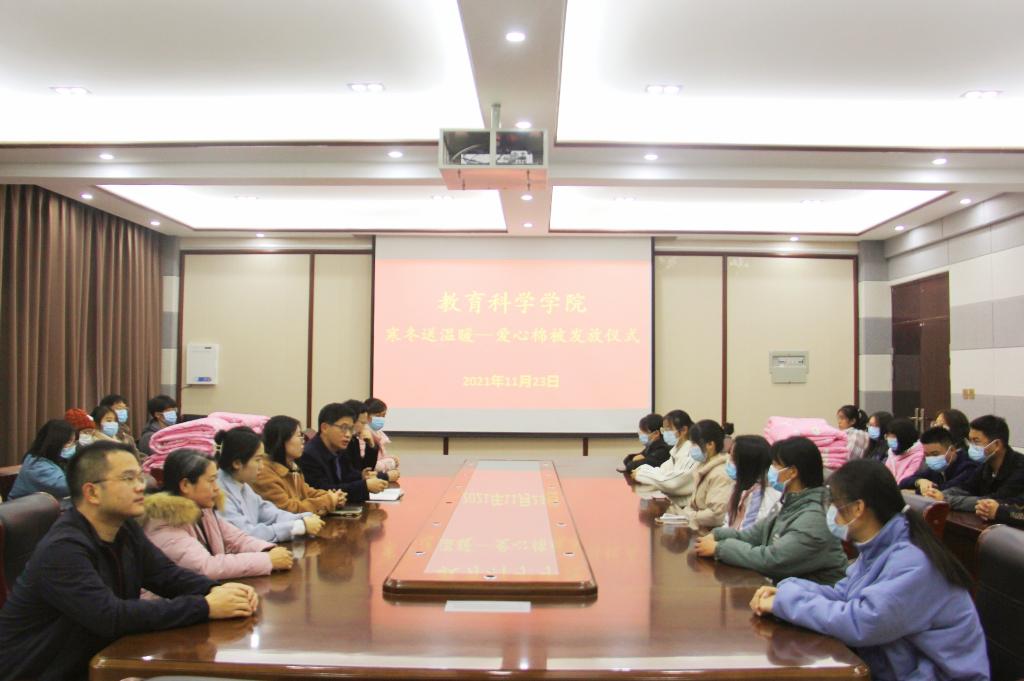 时间:2021-11-24 11:04:59 来源:教科院新闻部 作者:马玉娇 朱亚彤 齐家乐 阅读: 次11月23日,澳门正规电子游戏平台在教科楼402会议室举行“寒冬送温暖—爱心棉被发放”仪式,党委书记房加帅,副院长孙天义,团委老师朱方、2021级各班班主任以及领取棉被学生代表参加本次仪式。会议由朱方主持。