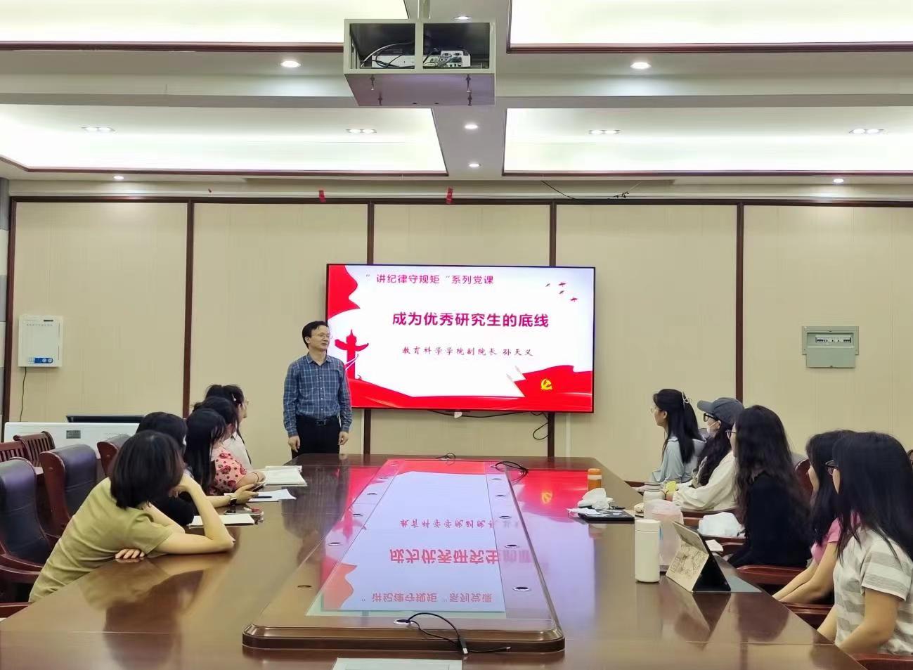 澳门正规电子游戏平台副院长孙天义以《成为优秀研究生的底线》为题,结合负面清单和典型案例,强调研究生党员要增强党性修养、保持优良党风、严守党的纪律、推进自我革命,处理好公与私、义与利、纪与情、道与术的关系,明大德、守公德、严私德、传美德,模范遵守法律法规、校规校纪、科研伦理和学术道德。