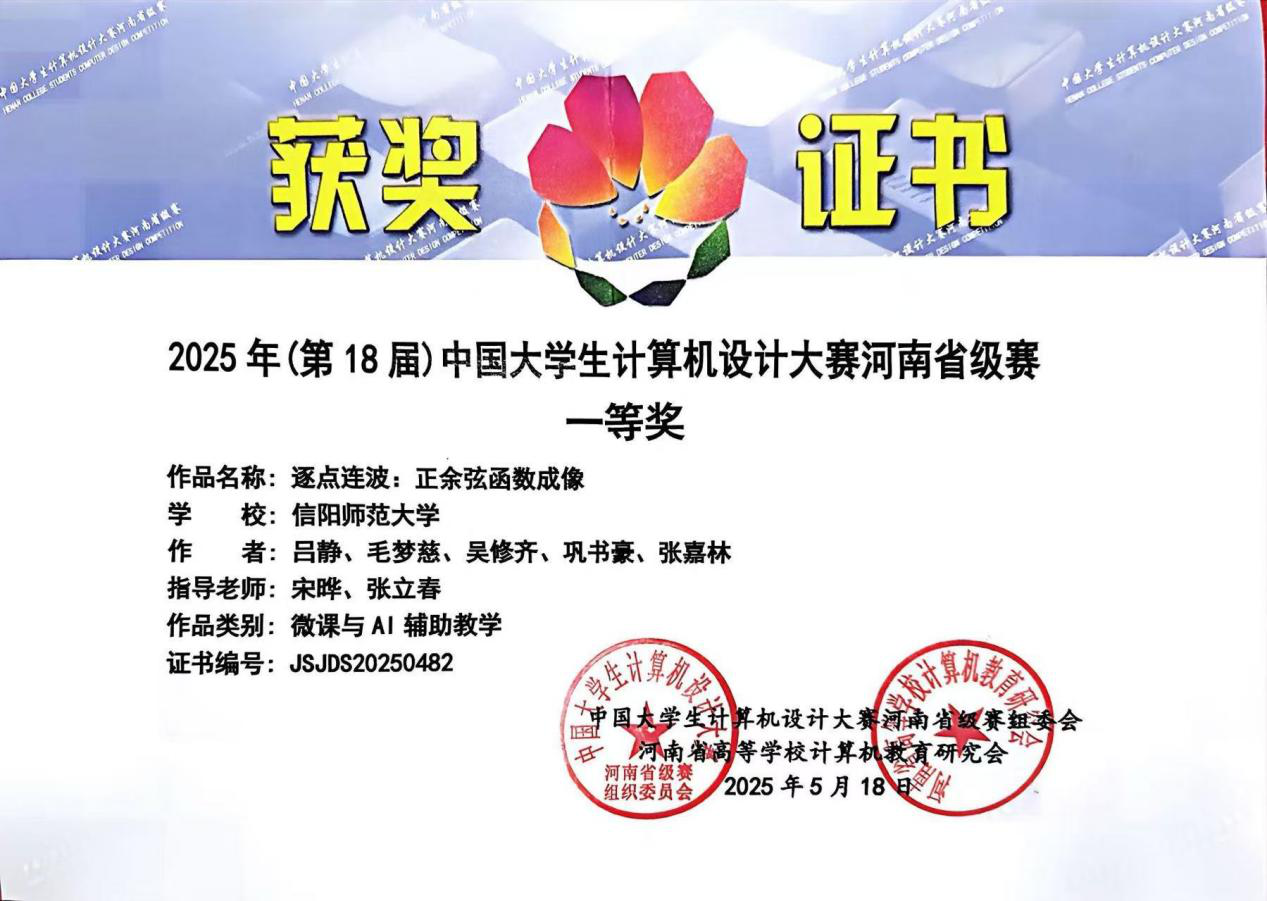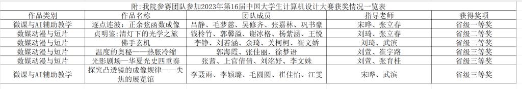 其中,《逐点连波:正余弦函数成像》《贞明鉴:清灯下的光学之旅》《佛手玄机》被省赛组委会推荐参加国家级第18届中国大学生计算机设计决赛。