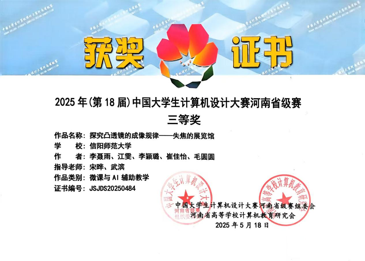 大赛采用校级初赛、省级复赛、国家级决赛三级竞赛形式。省级复赛采用作品展示、汇报和答辩相结合的方式进行评审。宋晔、张立春老师指导的《逐点连波:正余弦函数成像》获省赛一等奖,刘琦、张立春老师指导的《贞明鉴:清灯下的光学之旅》、刘琦、武滨老师指导的《佛手玄机》获省赛二等奖,刘萱、崔宇路老师指导的《温度的奥秘—热胀冷缩》、刘萱、张育桂老师指导的《光影剧场—华夏光史四重奏》、宋晔、武滨老师指导的《探究凸透镜的成像规律—失焦的展览馆》获省赛三等奖。