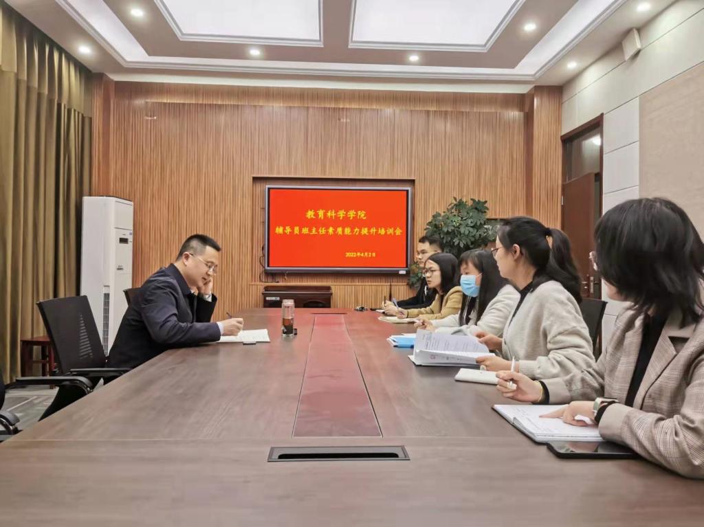 时间:2022-04-03 16:48:47 来源:教科院新闻部 作者:马玉娇 周媛媛 刘至涵 阅读: 次为促进班主任队伍整体工作水平的提升,扎实推进学院各方面工作高质量稳步前进,4月2日,澳门正规电子游戏平台在教科楼会议室召开班主任素质能力提升培训会,院党委副书记董银银与全体班主任(辅导员)参加会议。会议由董银银主持。