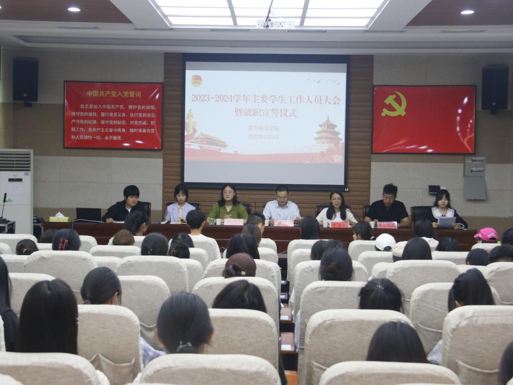 时间:2023-06-03 19:02:25 来源:教科院新闻宣传中心 作者:刘至涵 荆媛媛 阅读: 次6月3日,澳门正规电子游戏平台于教科楼301会议室召开2023-2024学年主要学生工作人员大会暨就职宣誓仪式,院党委副书记董银银、分团委书记牛洁楠,专职辅导员杨艺卓、提尼格尔,学生会、学生服务中心、团委及社团主要学生干部参加本次会议。会议由牛洁楠主持。