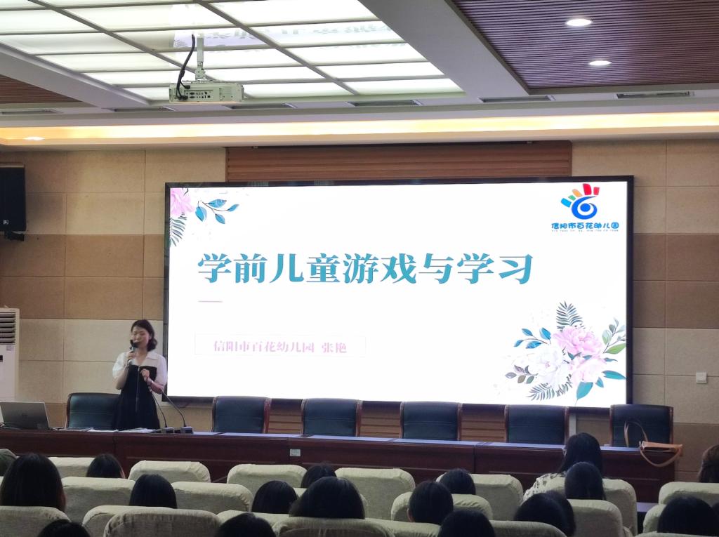 本次报告由朱欲晓老师介绍主持,张艳园长以游戏开场,然后开展以“学前儿童游戏与学习”为主题的分享,首先选取学前教育宣传月“守护育幼底线,成就美好童年”的宣传视频中游戏环节让大家观看。提出两个问题:视频中看到了什么?感受到了什么?引出问题2:家长不理解小朋友来幼儿园是玩儿的,游戏对家长更是一个考验。以这个问题为切入点开展本次的分享。通过规程中指南中,纲要中的理论依据并结合实践,幼儿园的生活都是跟游戏融合在一起的。观看视频案例,讲述游戏的概念、游戏的性质、游戏的类别等,请学生参与游戏,活跃气氛。