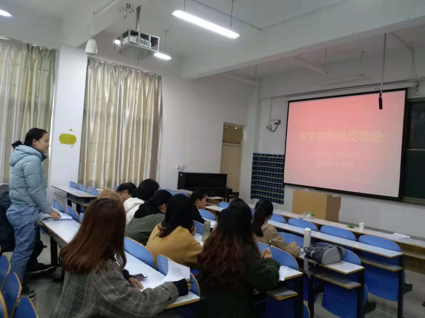 各位学生信息员针对教师教学内容、形式等方面提出问题并给出个人意见,对学生学习情况以及今后学习计划提出建议。老师对于学生信息员提出的各个问题与建议认真记录并与学生积极沟通。